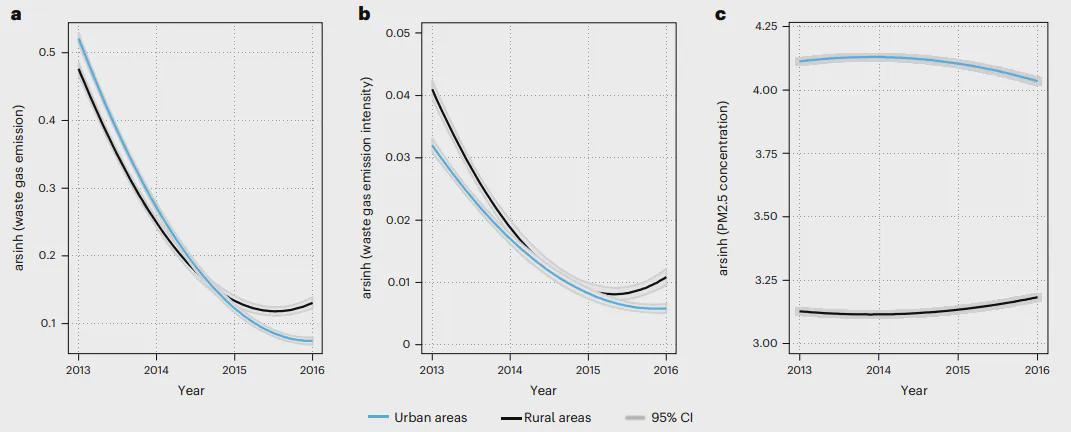 图 1. 2013–2016年中国城乡地区空气污染状况。a–c,我们展示了中国城乡地区的企业级废气排放(a)、企业级废气排放强度(b)以及1 km × 1 km网格级PM2.5浓度(c)。我们使用二次函数估计时间趋势,数据以估计均值(实线)±95%置信区间(灰色阴影)呈现。城乡地区分别拟合(蓝色实线代表城市地区,黑色实线代表农村地区)。所有变量均采用反双曲正弦变换(即 arsinh(x) = log[x + √x² + 1])。